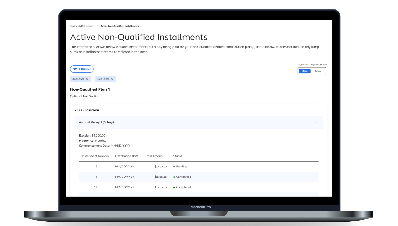 A net-new installment payments experience designed to clarify progress, timing, and structure across complex non-qualified plans.