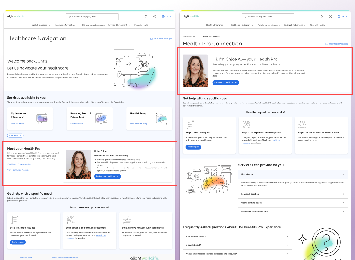 As Lead Product Designer, I was responsible for redesigning the Healthcare Navigation experience on the Alight platform, which offers both self-service tools—like a symptom checker, provider search, and health library—and access to a dedicated Health Pro for personalized healthcare support. The existing experience caused confusion among users, who were unclear about the roles of the Health Pro (assigned dedicated medical assistant) and Medical Ally (a registered nurse), misunderstood the asynchronous nature of communication, and were unaware of the different ways to access help. The landing page lacked clarity and failed to highlight the full spectrum of support options available, leading to missed opportunities for engagement and support.