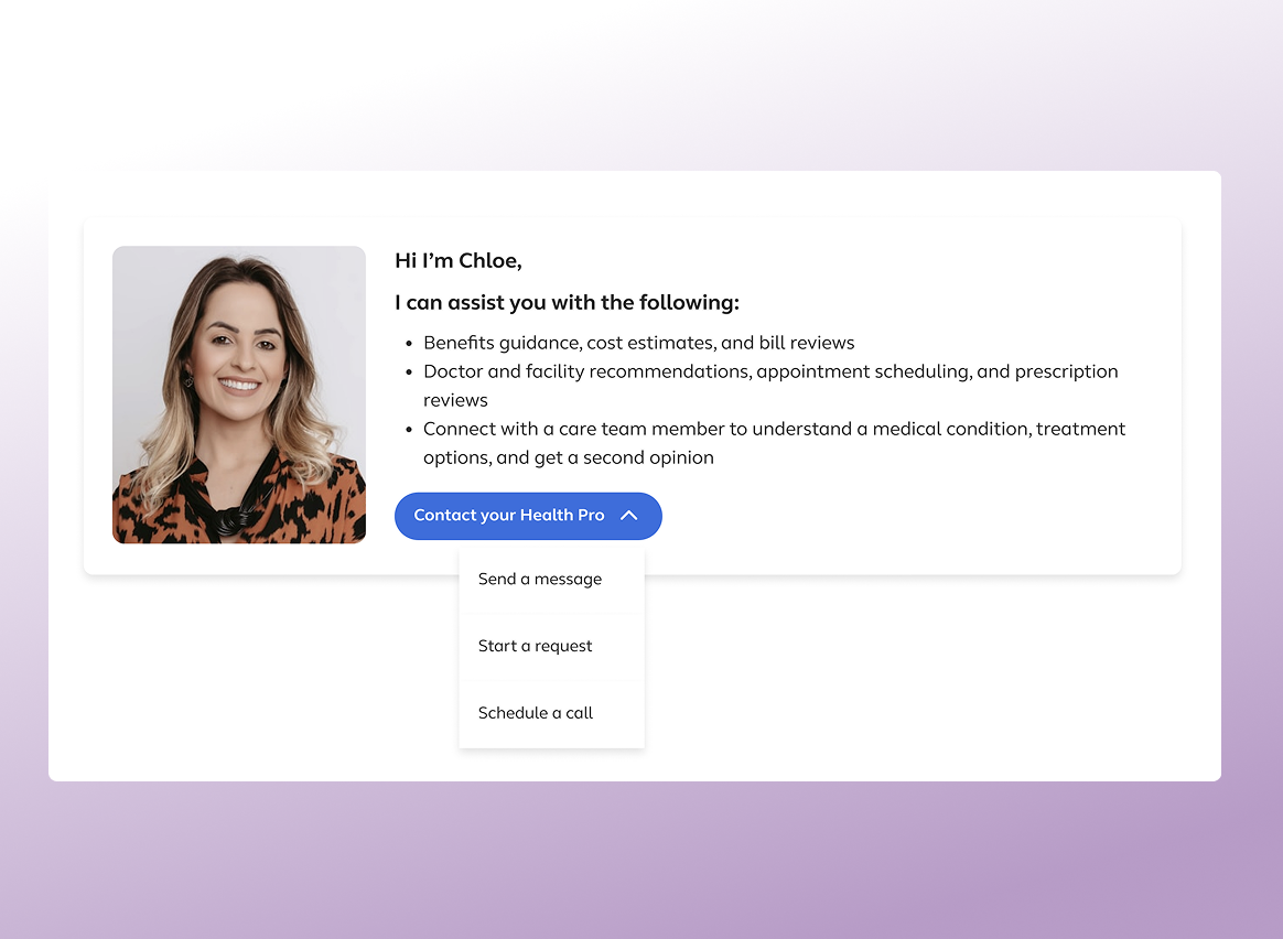 Users can contact their Health Pro in three ways: sending a message, starting a request, or scheduling a call. Initially, only "Send a message" was shown near the Health Pro, which caused confusion when other contact options appeared elsewhere. To improve clarity, we consolidated all communication methods into an overflow menu and tested the updated design. Users clearly understood the different options and how to access them.