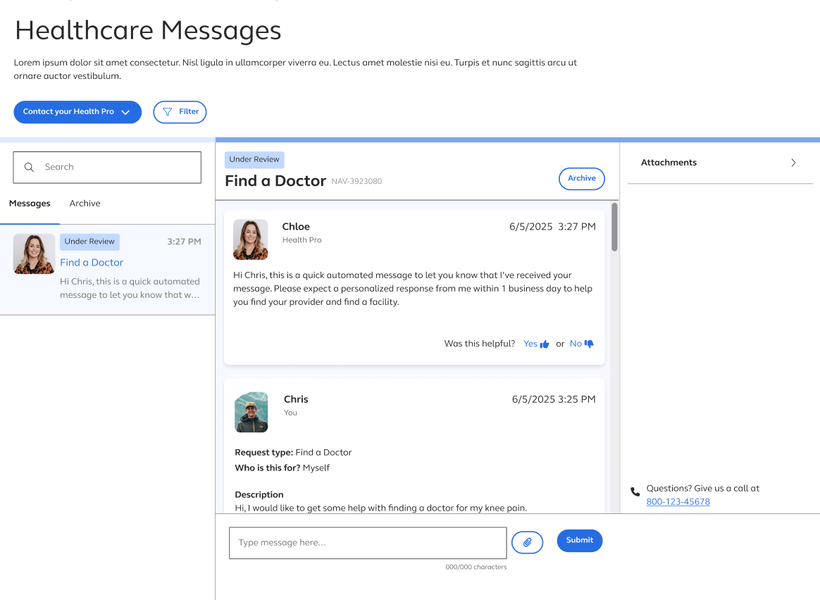 Through 4+ rounds of user testing, we continuously refined the Healthcare Navigation experience based on direct feedback, ultimately validating the effectiveness of our design solutions. The final implementation resolved key areas of confusion, improved users’ understanding of Health Pro roles, and increased engagement with both human and self-service support options. Users expressed greater confidence in navigating their healthcare journey and clearly understood how and when to reach out for support.