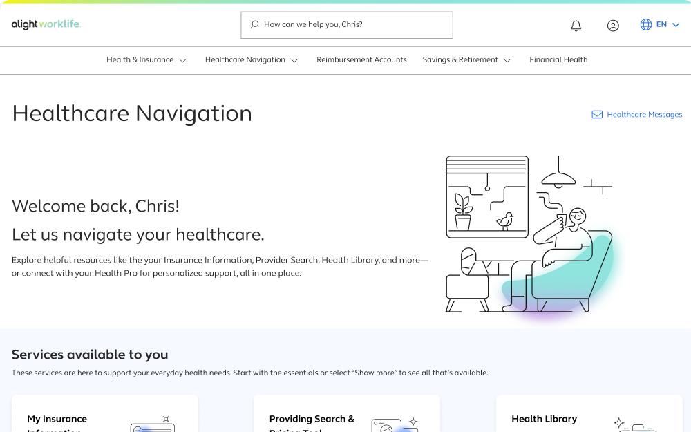 Healthcare Navigation is a core feature within the Alight platform that connects users to a mix of self-service tools—such as provider search, a health library, and symptom checkers—and human-led support through assigned Health Pros. The goal of the product is to help users manage their healthcare journey with confidence, offering both digital autonomy and guided assistance.
