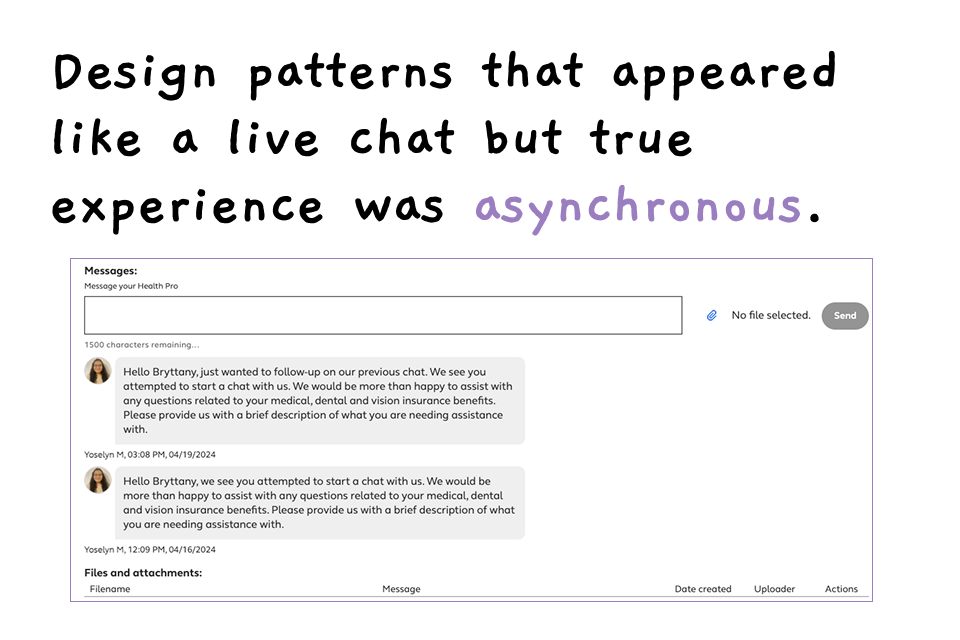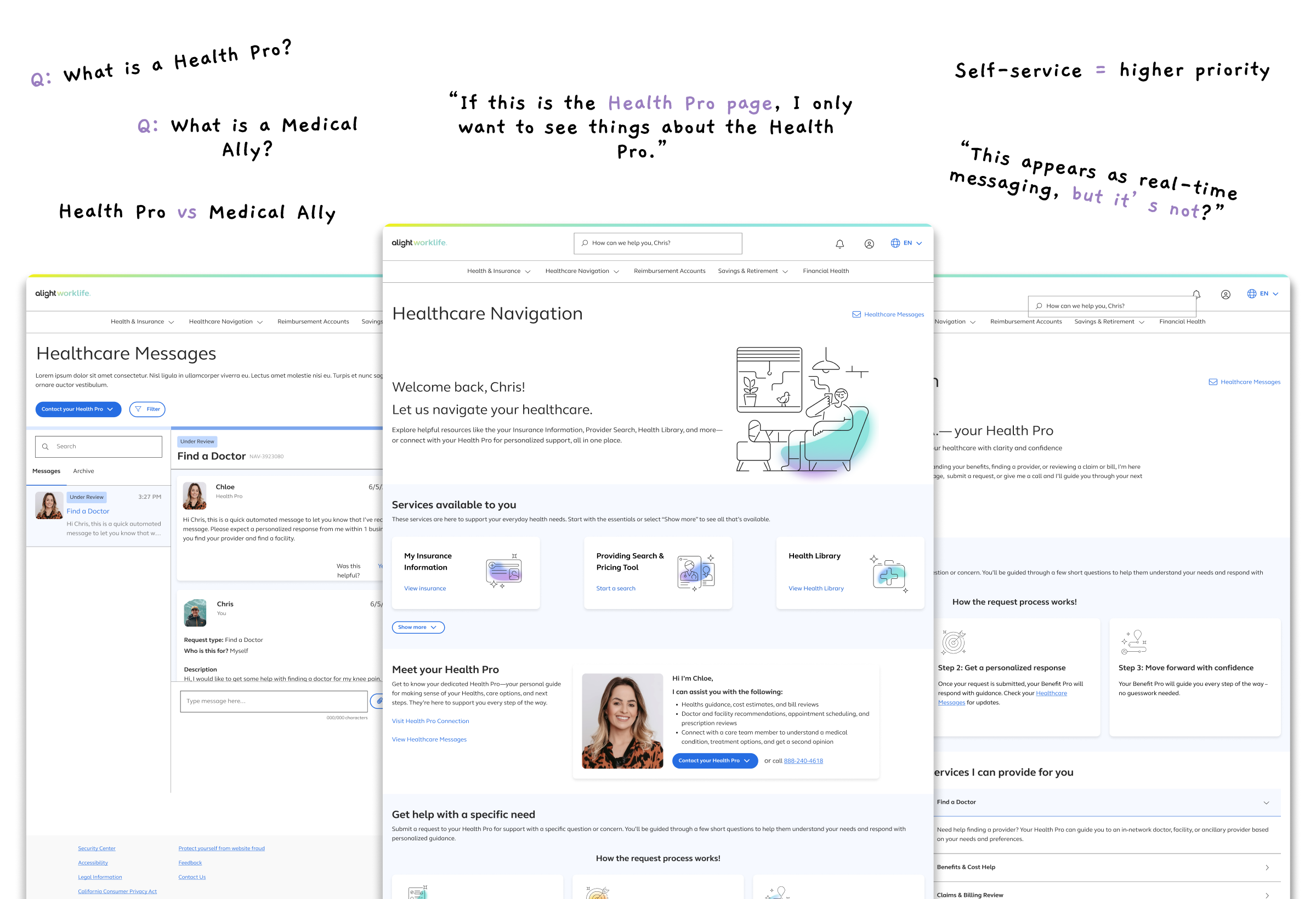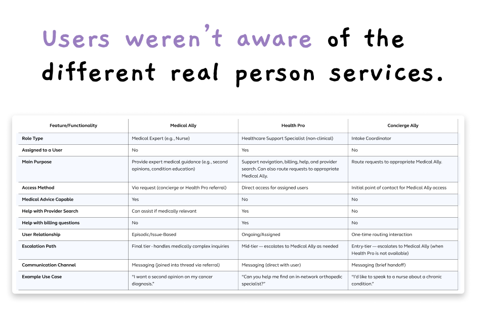 Users were struggling to differentiate between Health Pros and Medical Allies, expecting live chat functionality when messaging asynchronously, and overlooking self-service features due to poor page hierarchy. From a business standpoint, there was an urgent need to reinforce the value of the Health Pro model, improve engagement, and fulfill contractual feature expectations for key clients—driving a time-sensitive redesign effort.