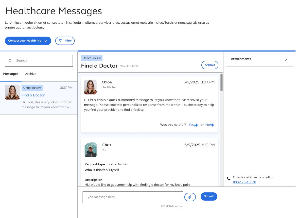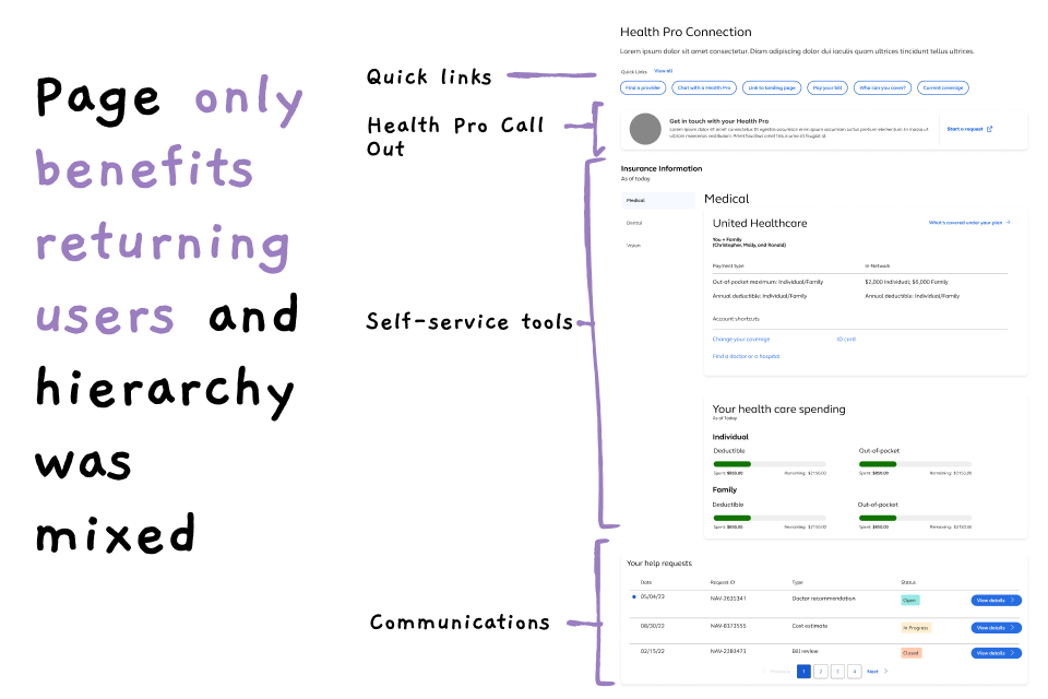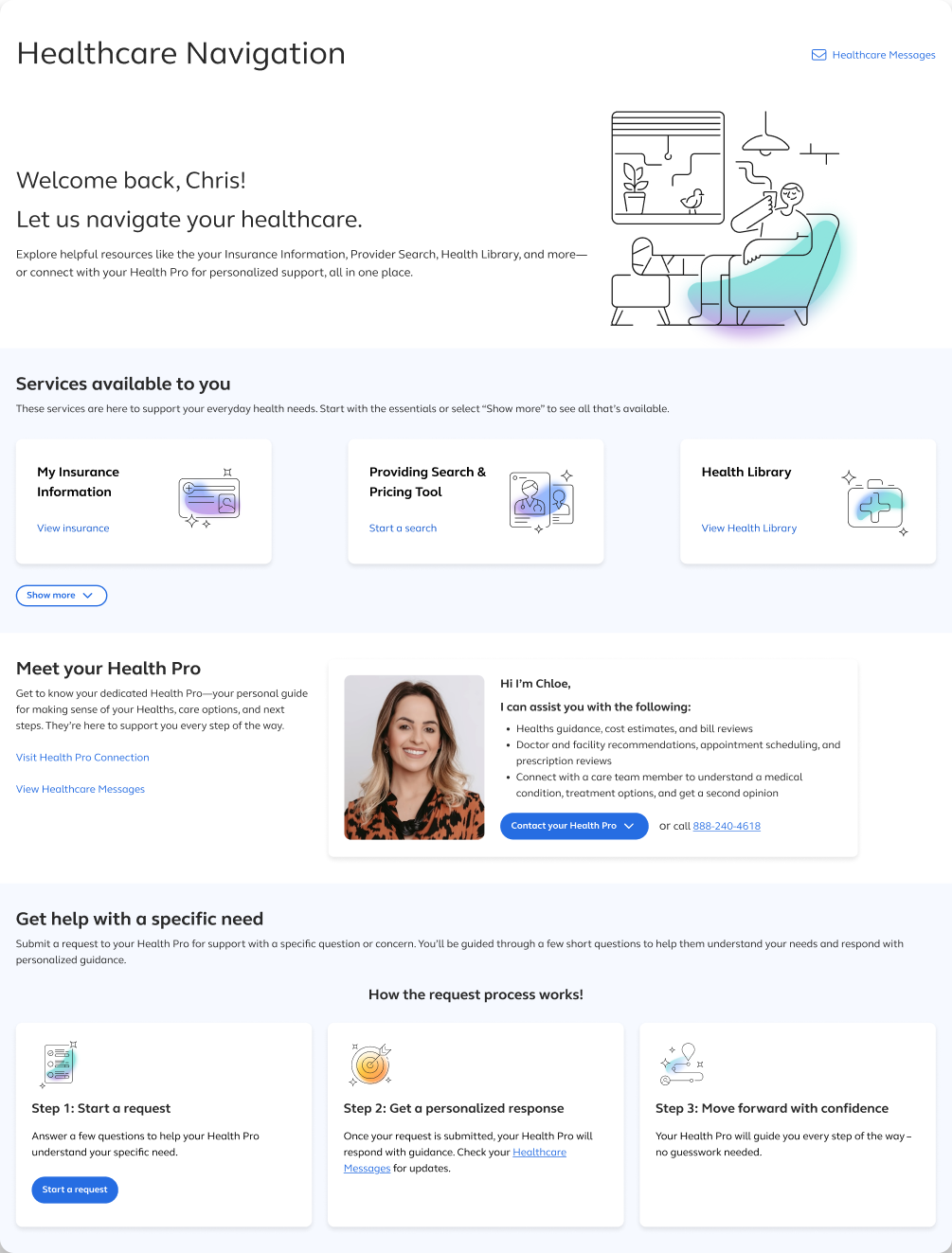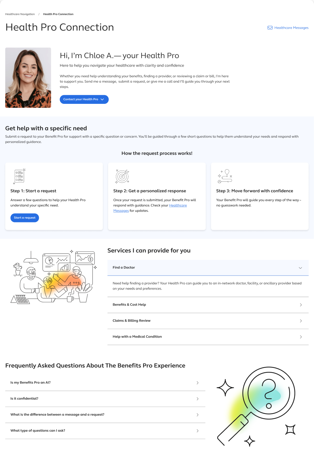 The existing experience had grown unclear over time, with overlapping features, evolving terminology, and interface inconsistencies that left users confused about where to go and who to contact. As healthcare support needs grew more complex, it became essential to simplify the experience, clarify expectations, and make both self-service tools and Health Pros more discoverable.